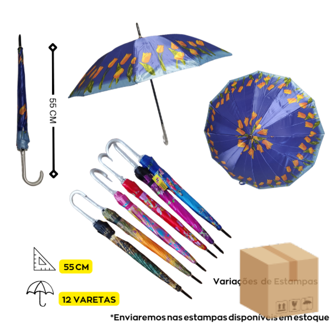 Descrição: Guarda chuva de 55cm com 12 varetas, abertura automática, cabo curvado. Disponível em diversas cores e estampas.